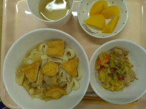 きつねうどん、キャベツの肉味噌炒め、もも缶(塩昆布おにぎり)