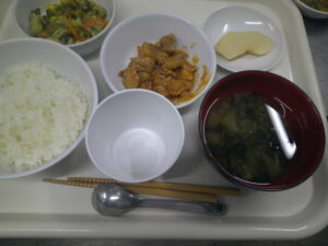 ご飯、みそ汁、タンドリーチキン、ブロッコリーの玉ねぎドレッシング、りんご(おやつ・レーズン蒸しパン)