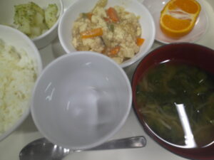 ご飯、みそ汁、炒り豆腐、粉ふきいも、みかん(おやつ・パイナップルゼリー)