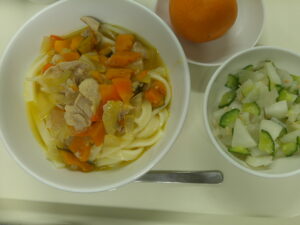 ほうとう風うどん、かぶのサラダ、みかん(七草粥風おにぎり)
