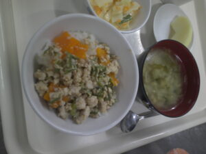 三色丼、そうめん汁、短冊サラダ、りんご(おやつ・フルーツポンチ)