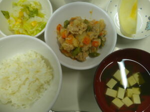 御飯、すまし汁、鶏肉の鉄火煮、キャベツとコーンのサラダ、りんご