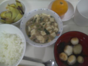 御飯、すまし汁、麻婆豆腐、さつまいもの甘...