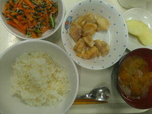 御飯、みそ汁、からあげ、ほうれんそうのしらすあえ、りんご