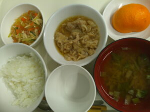 御飯、みそ汁、豚肉のおろし煮、バンサンスー、みかん(米粉と豆腐のブラウニー)