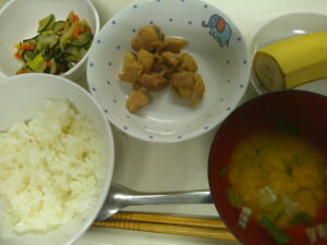 御飯、みそ汁、鶏肉のマーマレード焼き、即席漬け、ばなな(小倉サンド)
