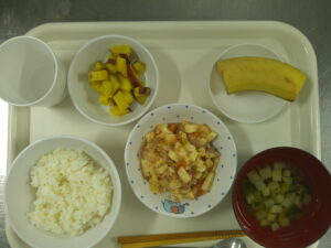 御飯 すまし汁(かぶ・わかめ) 家常豆腐 さつまいものレモン煮 バナナ