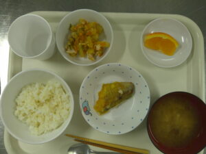 御飯 みそ汁(だいこん・なめこ) 白身魚のカレームニエル じゃがいもきんぴら オレンジ