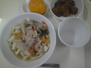 肉うどん、かぼちゃのいとこ煮、みかん(おやつ・鶏ごぼうごはん)